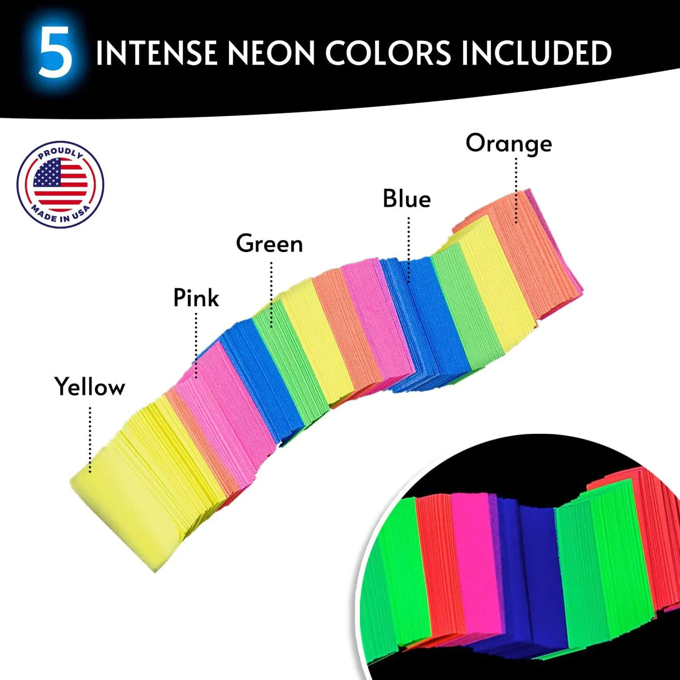 - ✔️ BLACKLIGHT REACTIVE COLOR - These wedding confetti feature 5 intense colors, pink, orange, yellow, green and blue, and are fully blacklight reactive, transforming your event into a veritable mesmerizing place within seconds!